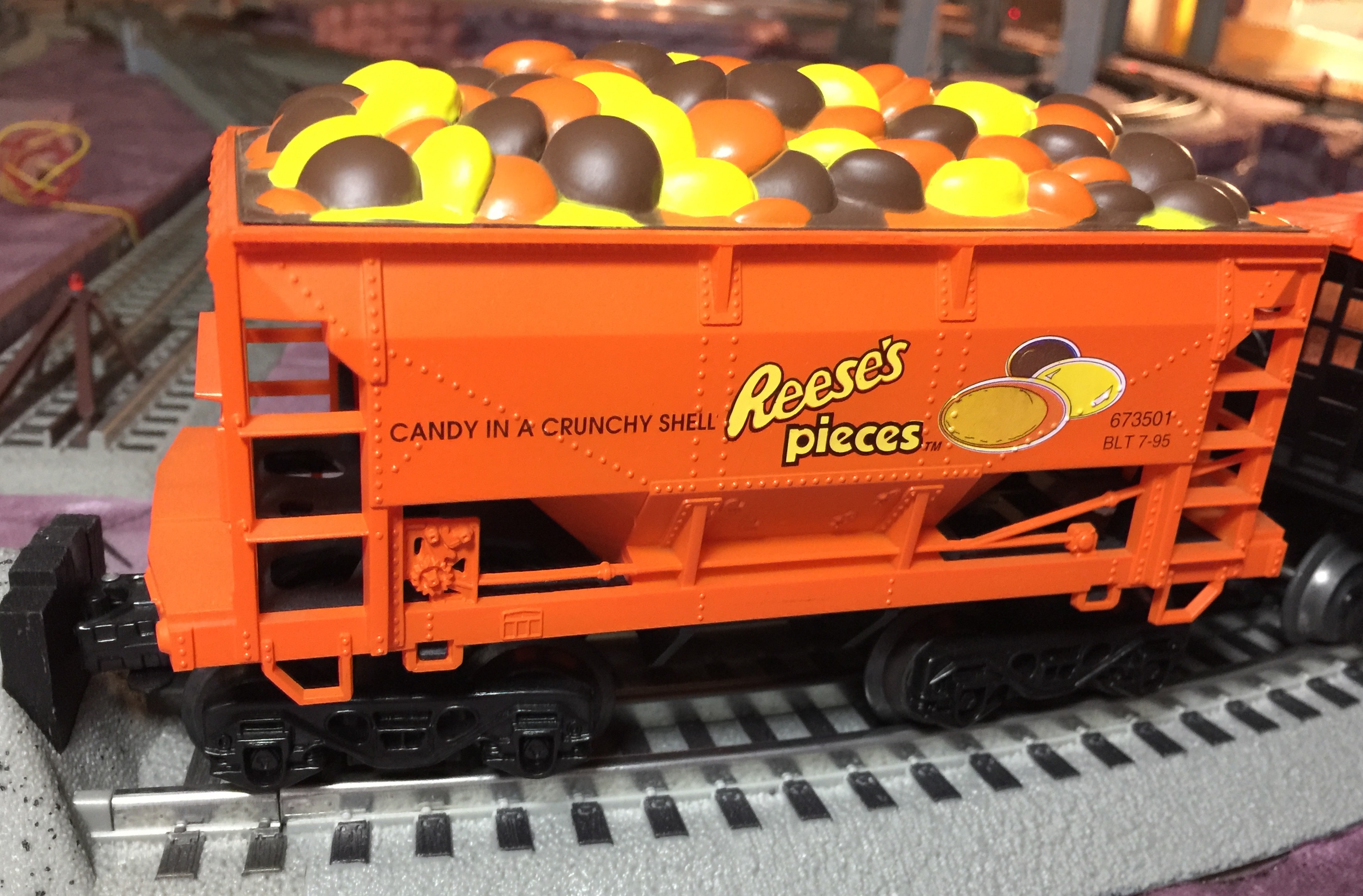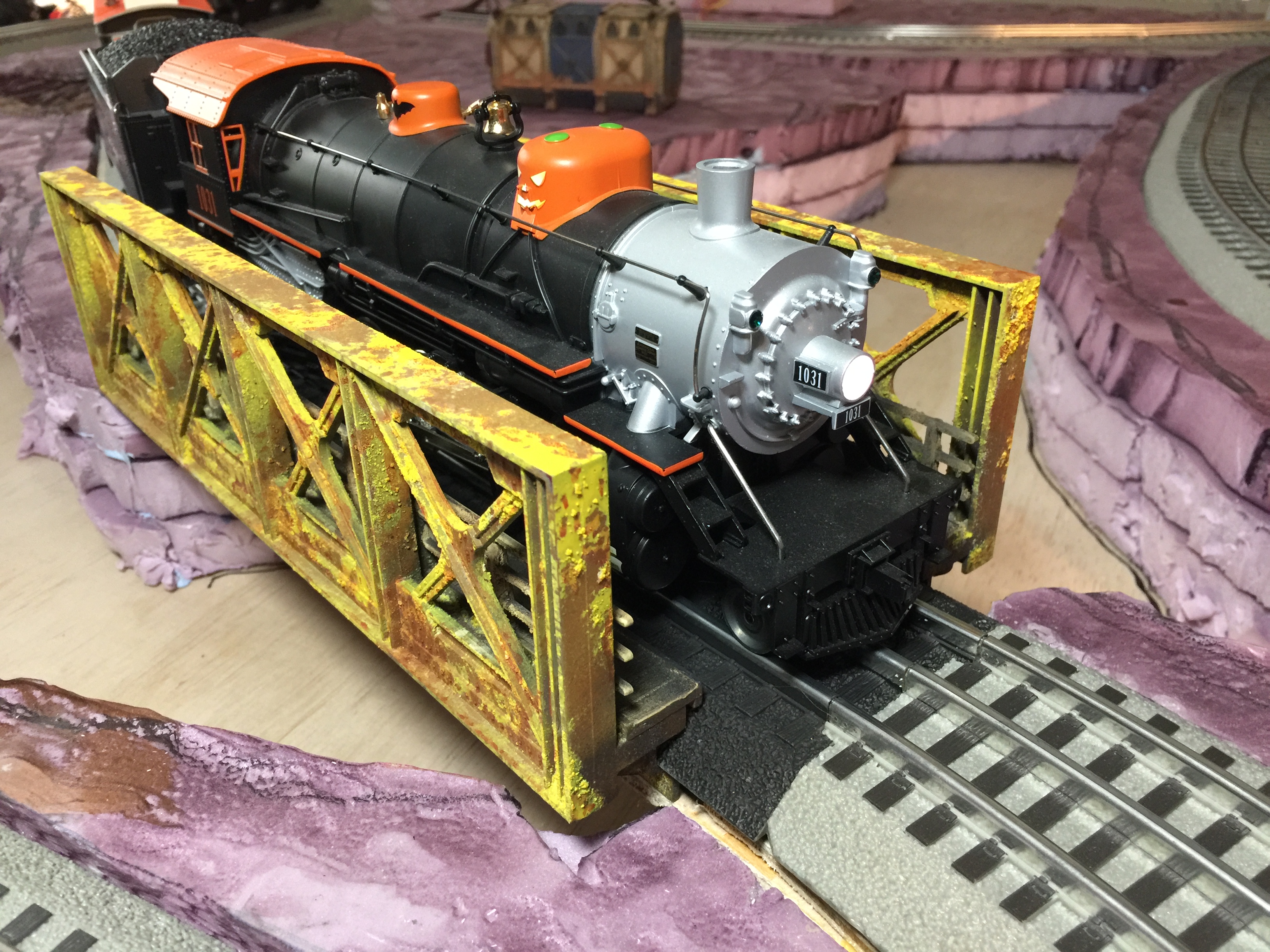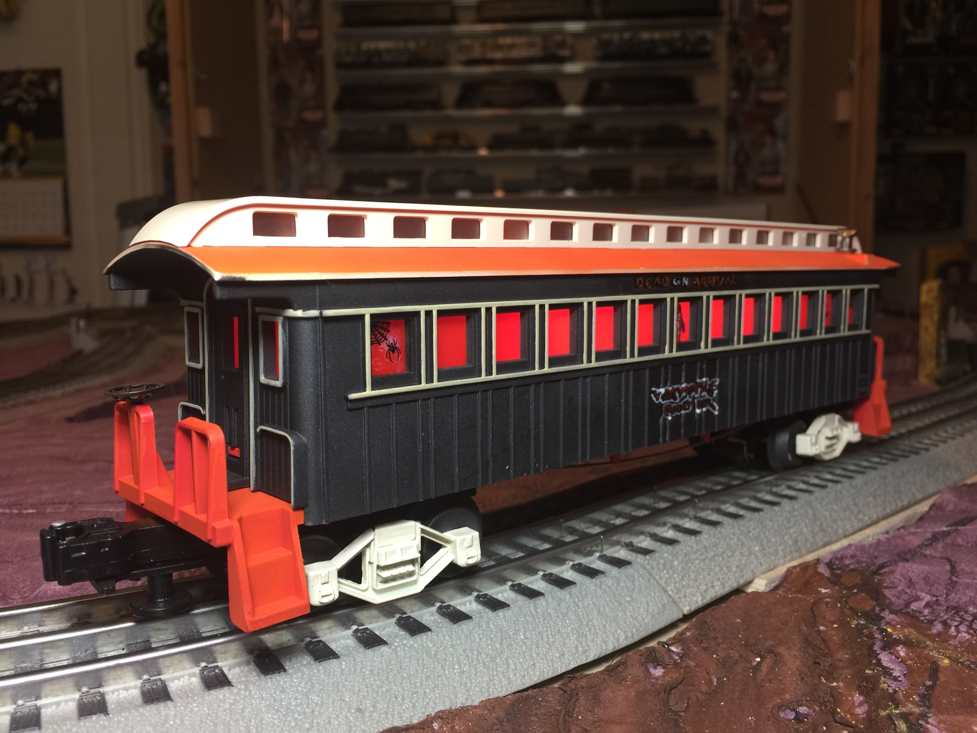 Introducing the End of the Line Express Halloween Train. The Lionel Lionchief Plus ELX Bershire Express Halloween Steam Engine is pulling a passenger car which was customized using a Budweiser train car and now named the Dead on Arrival passenger car. The End of the Line Caboose comes next which offers a full service of haircuts and facials to new headless horseman candidates. The final car is a Reese’s Pieces stock car just in case the Vampire Blood Bar (located in the Dead on Arrival car) runs out of snacks. This train may arrive anywhere at anytime on the ADP train/gaming table. Look out for a future Halloween Town during the right time of year.